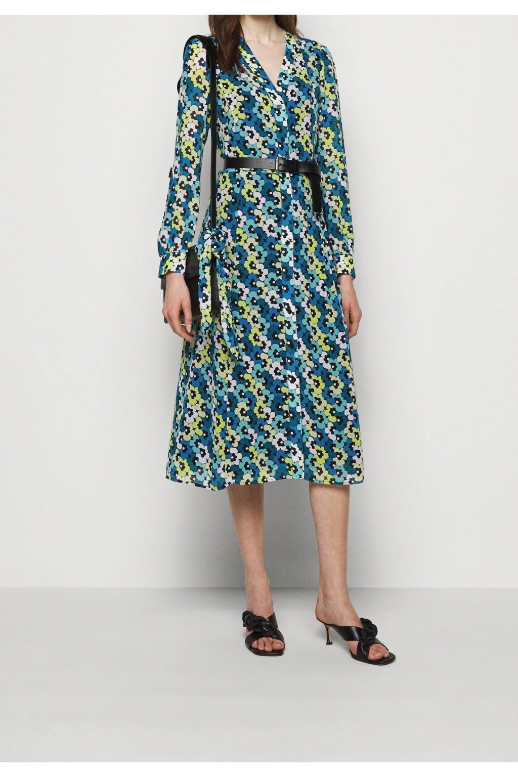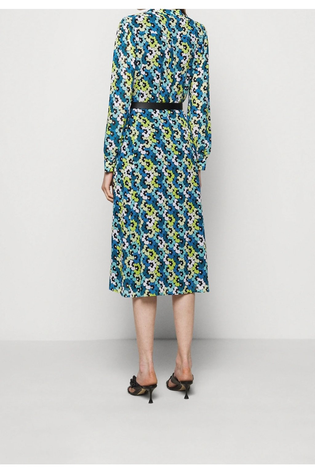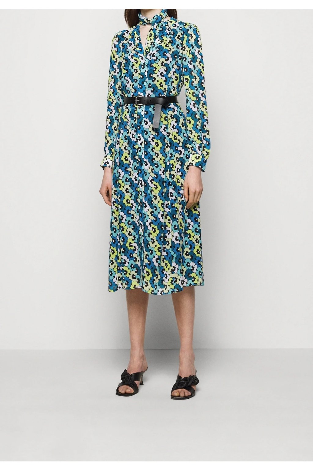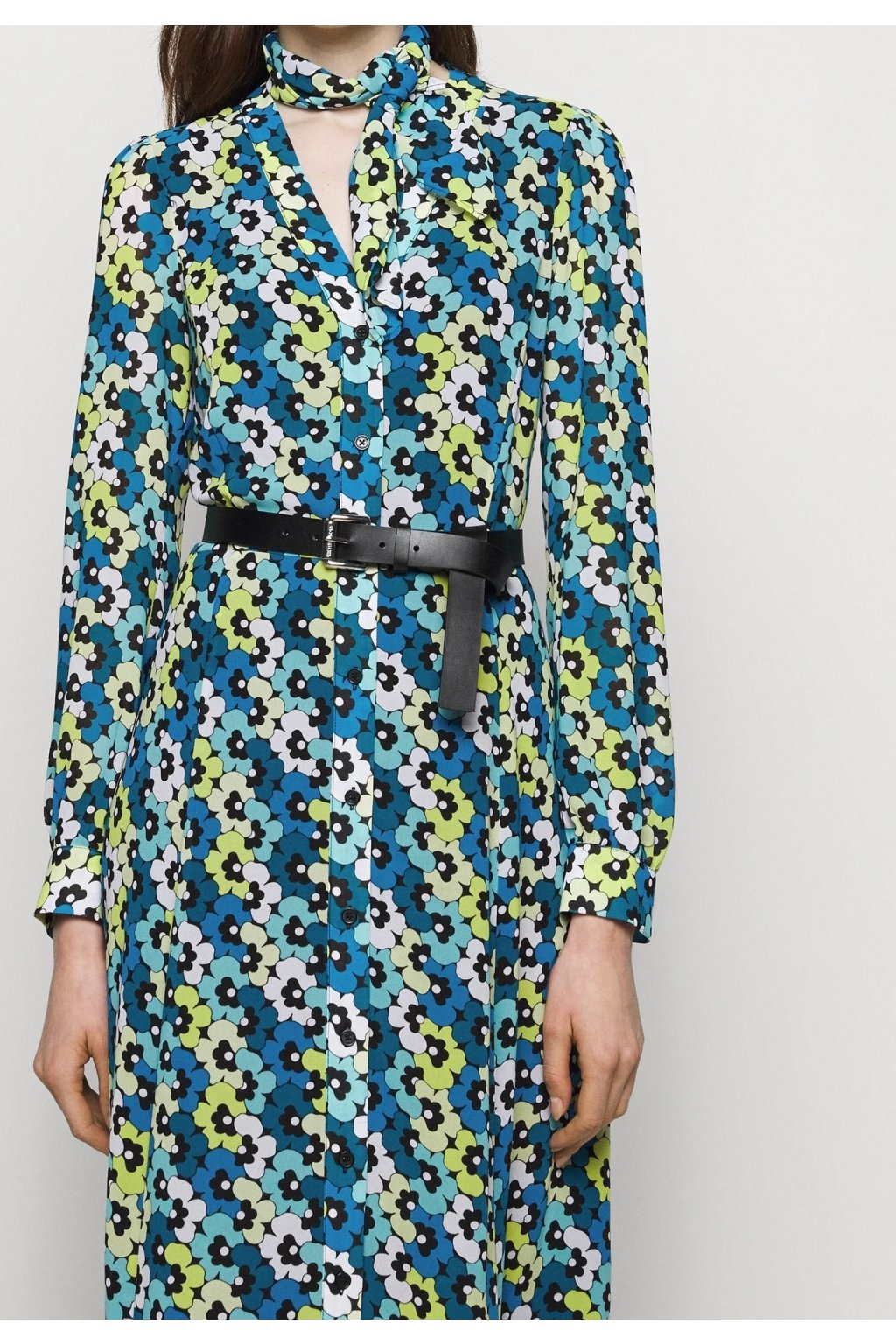 Stylové midi košilové šaty s celoplošným retro květinovým potiskem v odstínech modré, zelené a bílé. Mají elegantní výstřih do V, klasické knoflíkové zapínání po celé délce a dlouhé rukávy zakončené manžetami. V pase je černý pásek, který krásně zvýrazní siluetu. Součástí je i šátek ve stejném vzoru, který lze uvázat kolem krku pro stylový detail. Ideální pro každodenní nošení i neformální společenské příležitosti.