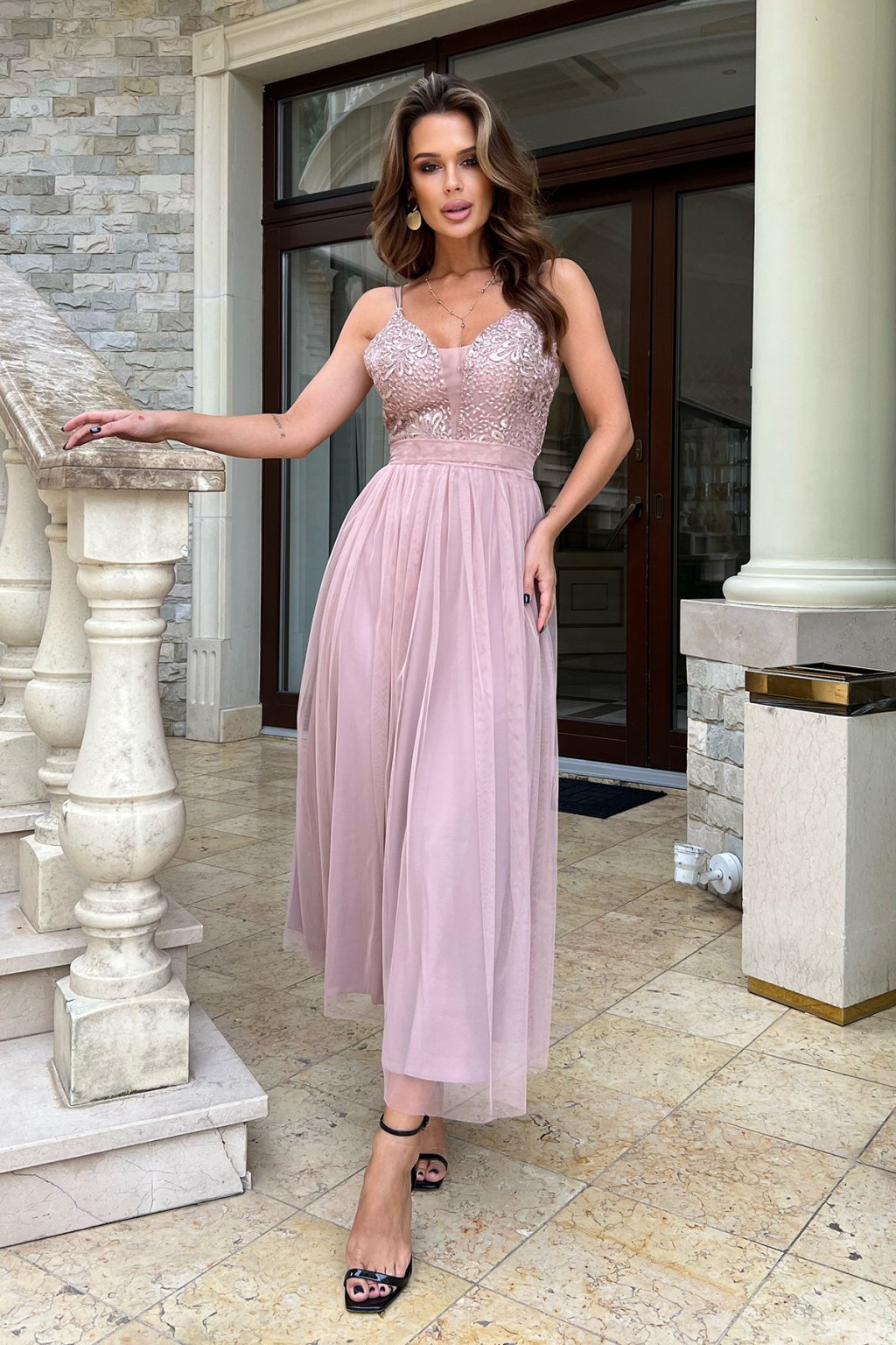 Jemně vyšívaný vršek na tenká ramínka krásně zvýrazní dekolt a dodá šatům luxusní nádech. Lehounká tylová sukně působí vzdušně a při chůzi vytváří nádherný splývavý efekt. Elegantní střih podtrhne ženskou siluetu a dodá vám sebevědomý, ale stále něžný vzhled.
