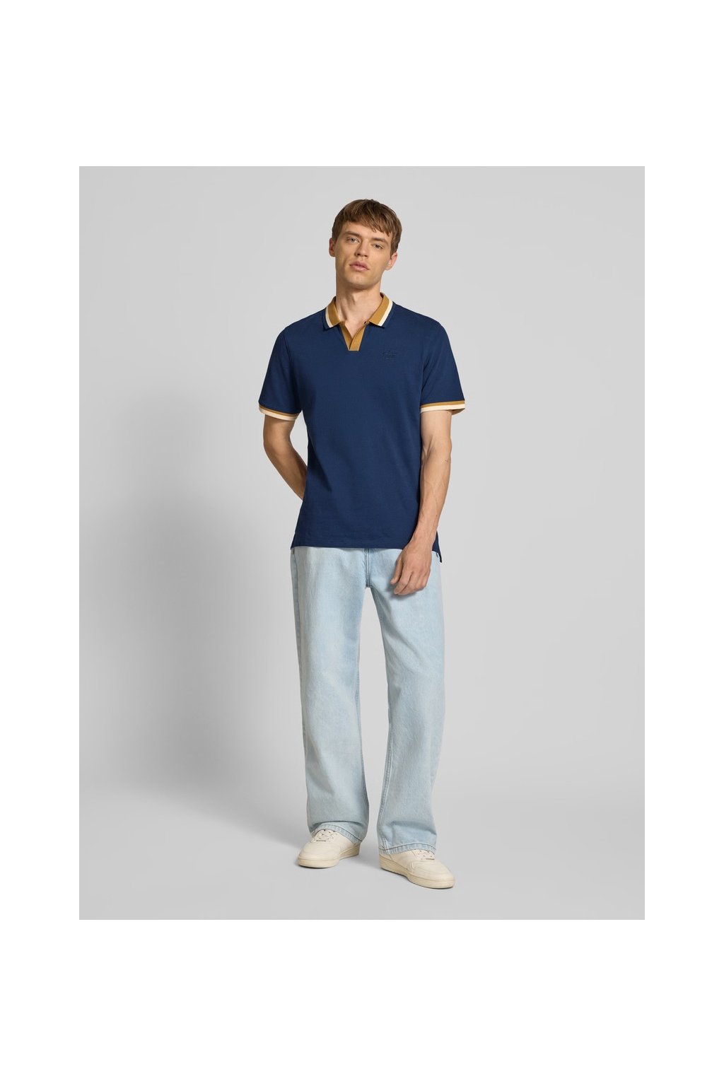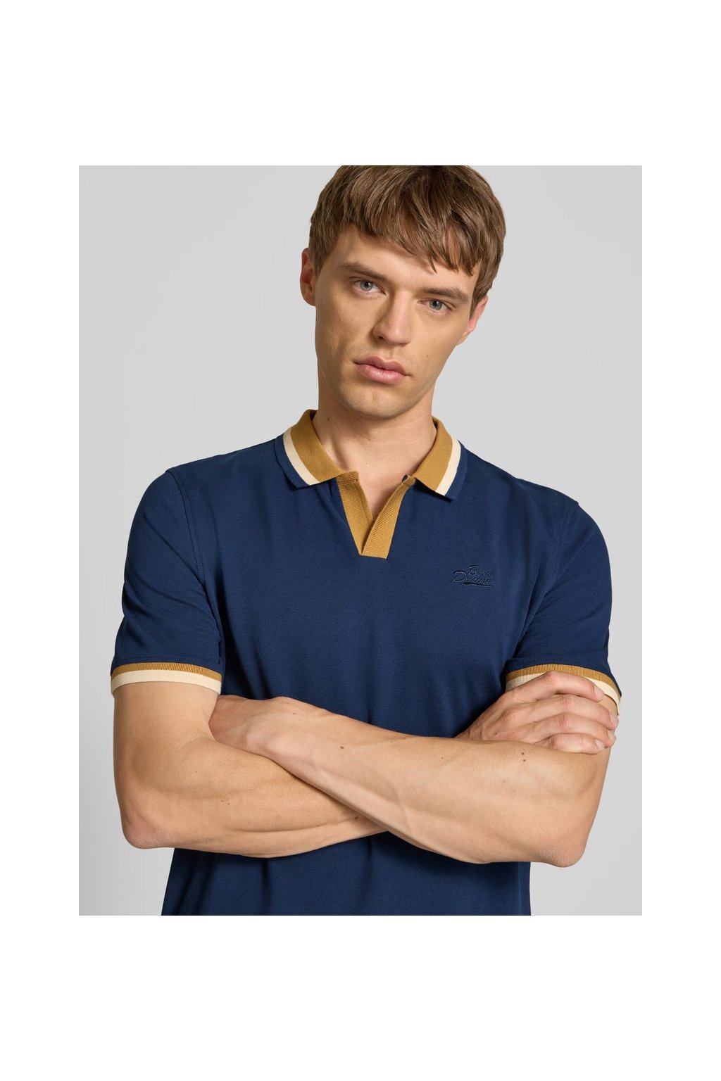 Pánské polo tričko Blend z modelové řady 'Evo' v námořnicky modré barvě představuje ideální kombinaci pohodlí a stylu. Klasický střih Regular Fit zajišťuje volnost pohybu a pohodlné nošení po celý den. Tričko zaujme originálním provedením výstřihu do „V“ bez knoflíků a kontrastními detaily na límečku a rukávech v hořčicové a bílé barvě. Na hrudi se nachází decentní výšivka „Blue Denim“, která podtrhuje celkový čistý vzhled. Díky 100% bavlně je materiál příjemný na dotek a prodyšný, což z něj dělá skvělou volbu pro teplejší dny. Skvěle se hodí k džínám, chino kalhotám nebo šortkám pro volnočasový nebo smart casual outfit.