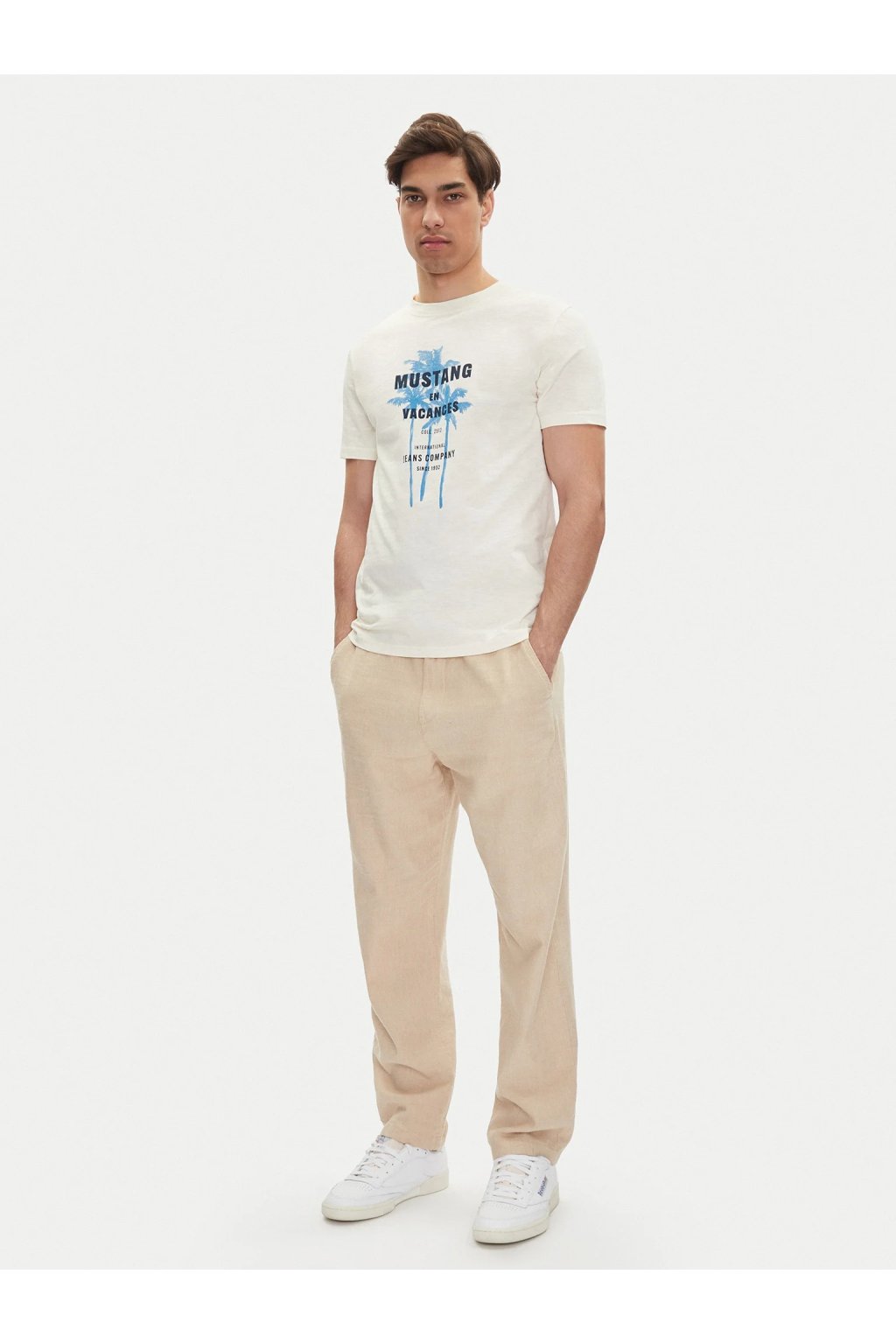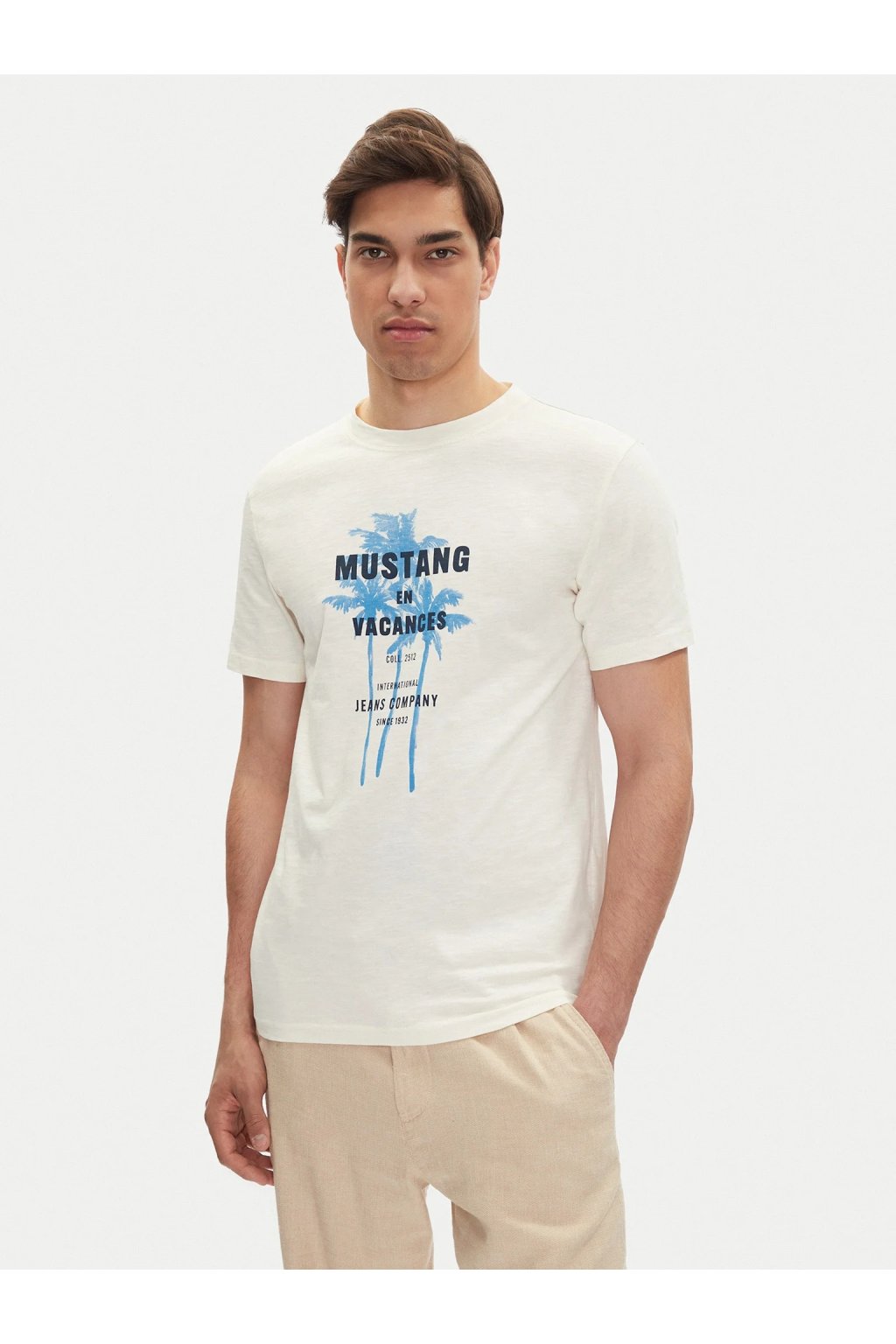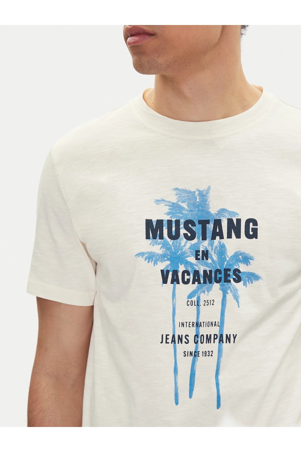 Přední stranu zdobí potisk s motivem palem a nápisem "Mustang en vacances", což dodává tričku dovolenkový a uvolněný vibe. Zadní strana je čistá bez potisku. Tričko má klasický střih s kulatým výstřihem a krátkými rukávy.