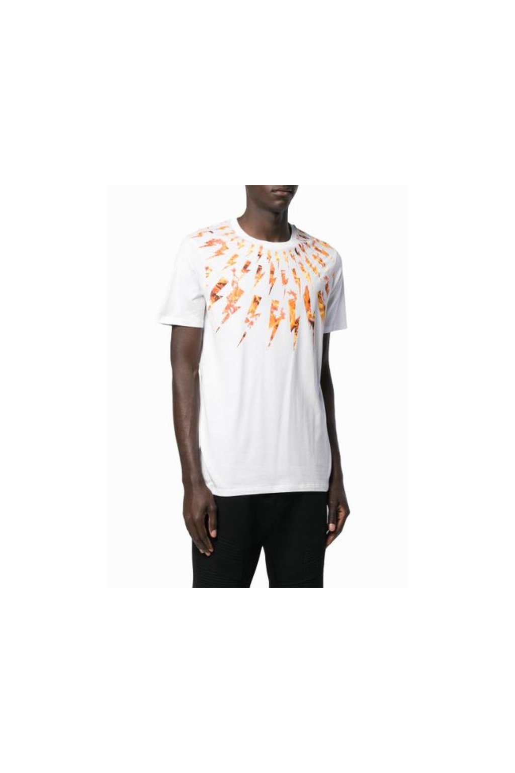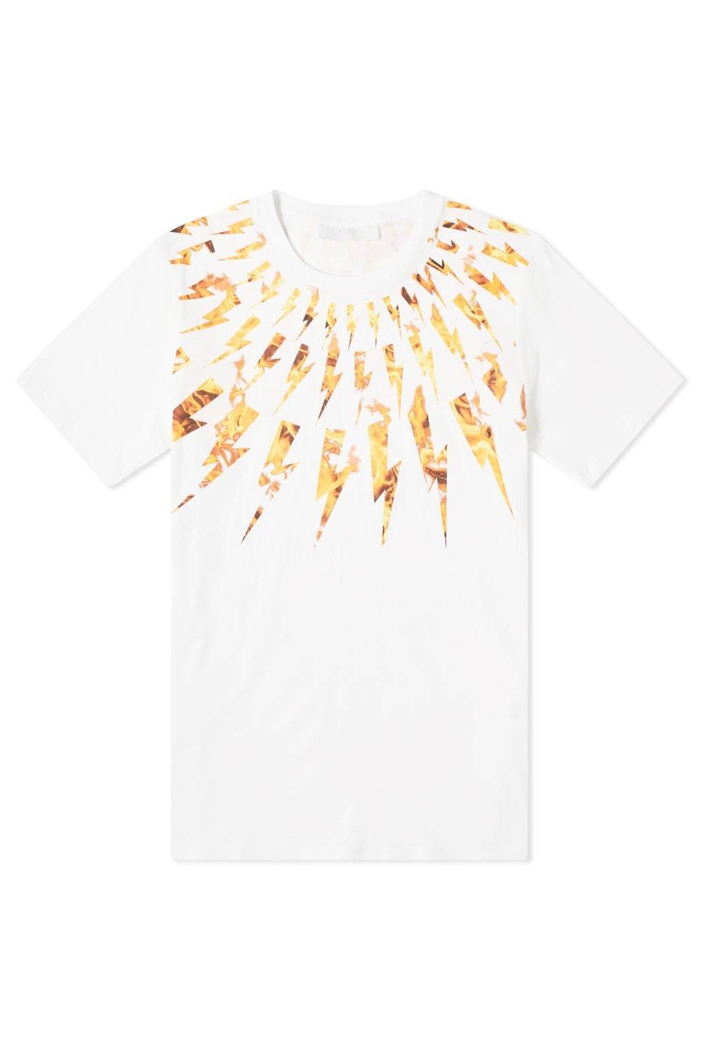 Dodejte svému outfitu energii s ikonickým tričkem od návrháře Neil Barrett. Model Flame Lightning Bolt Tee zaujme výrazným potiskem blesků kolem výstřihu, tentokrát v ohnivé, plamenné variantě, která symbolizuje sílu, styl a originalitu.