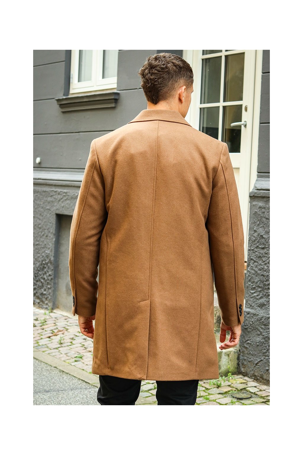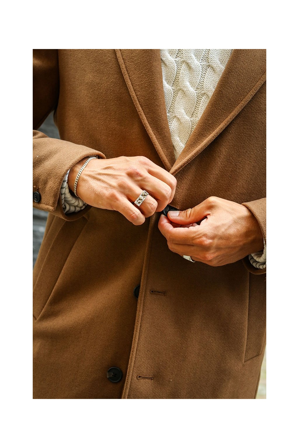 Klasický střih s elegantním klopovým límcem a jednoduchým zapínáním na tři knoflíky dodává kabátu tradiční charakter. Díky třem knoflíkům jej lze nosit zapnutý nebo rozepnutý podle počasí či osobního stylu. Zadní rozparek zajišťuje volnost pohybu a zároveň podtrhuje sofistikovaný design.