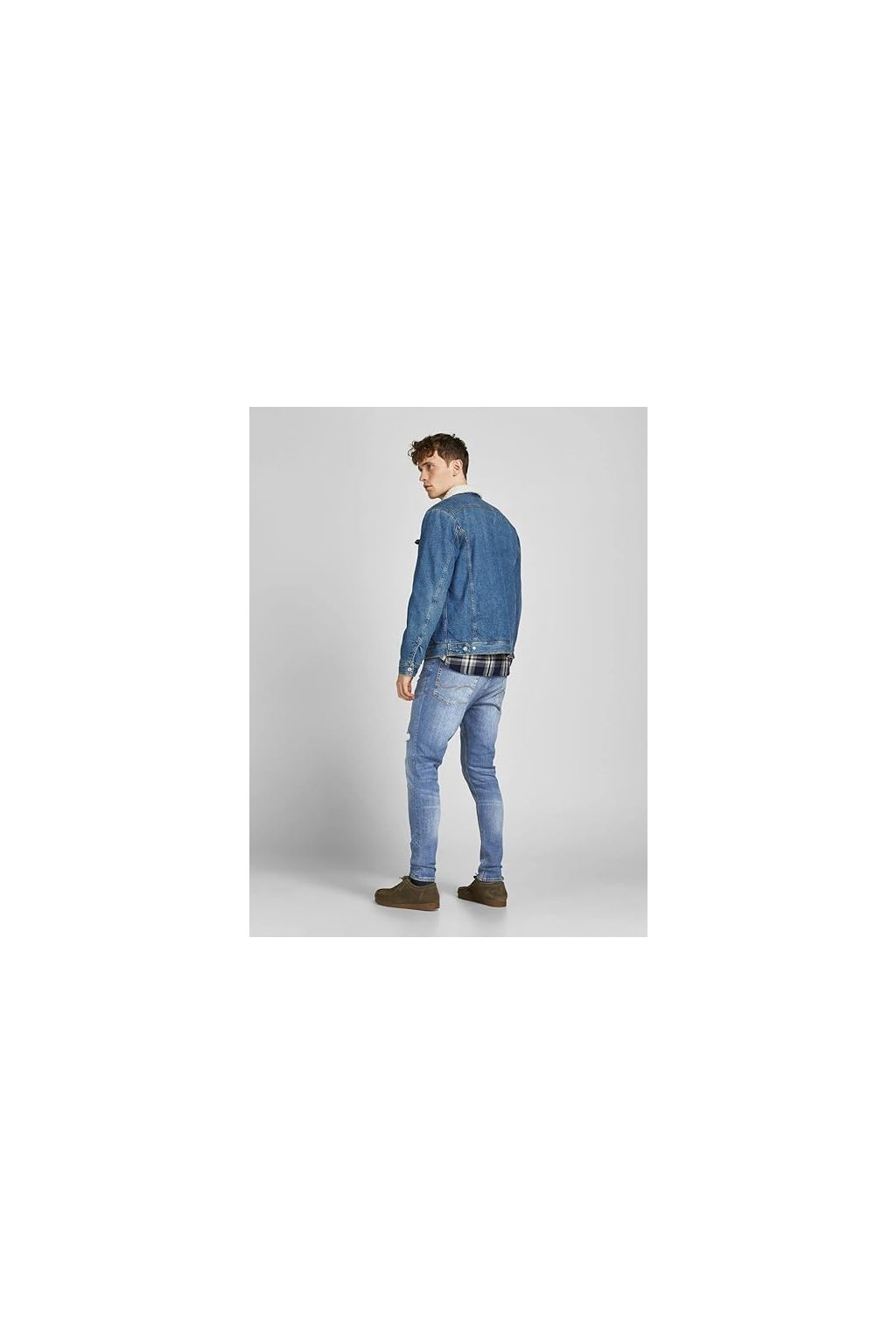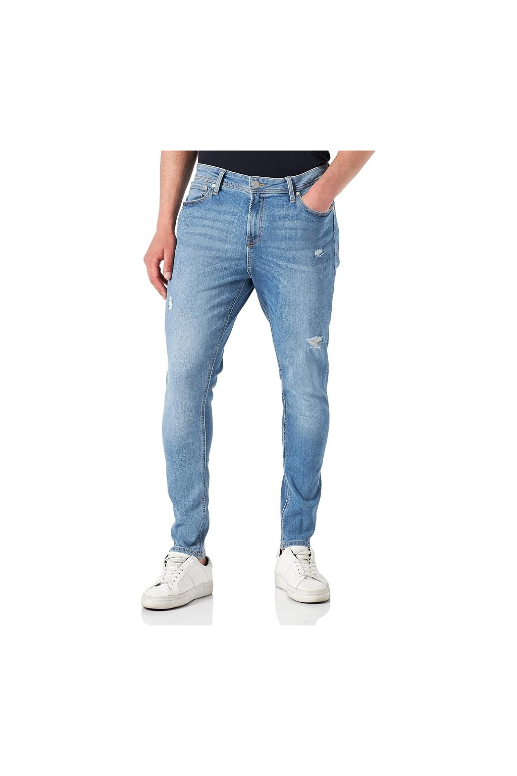 Pánské džíny JACK & JONES v slim fit střihu v moderní světle modré barvě. Mají opotřebovaný vzhled s jemnými dírkami, pohodlný denim materiál a pružnost pro celodenní nošení. Klasické kapsy a kožený štítek na zadní straně pasu. Ideální pro volnočasový styl, snadno kombinovatelné s tričkem nebo mikinou.