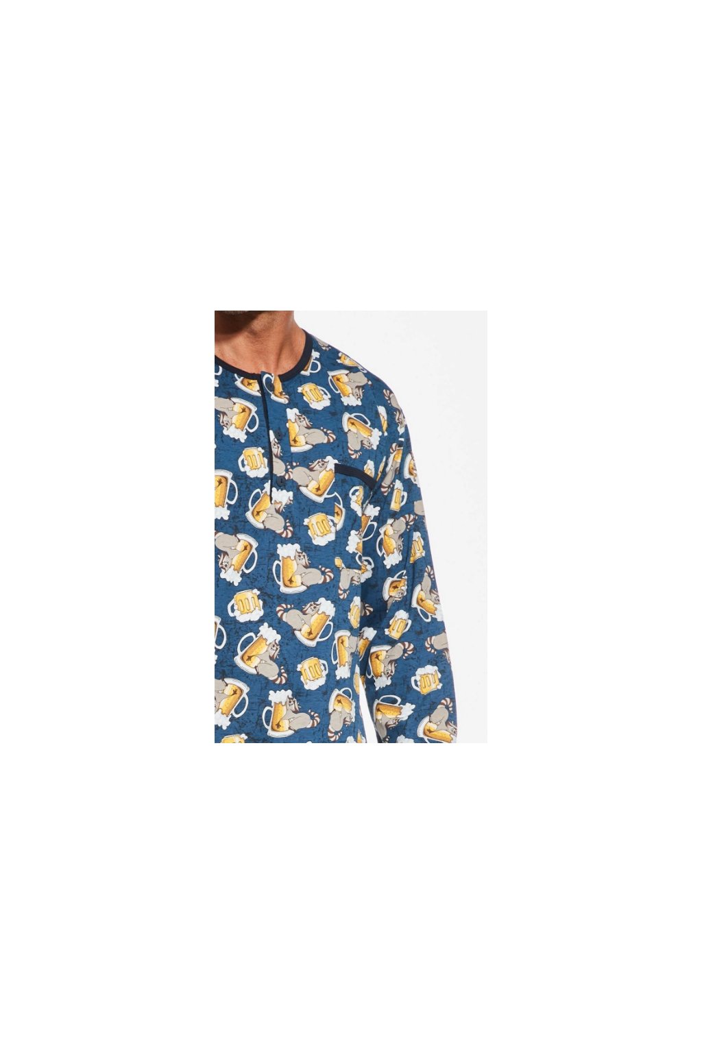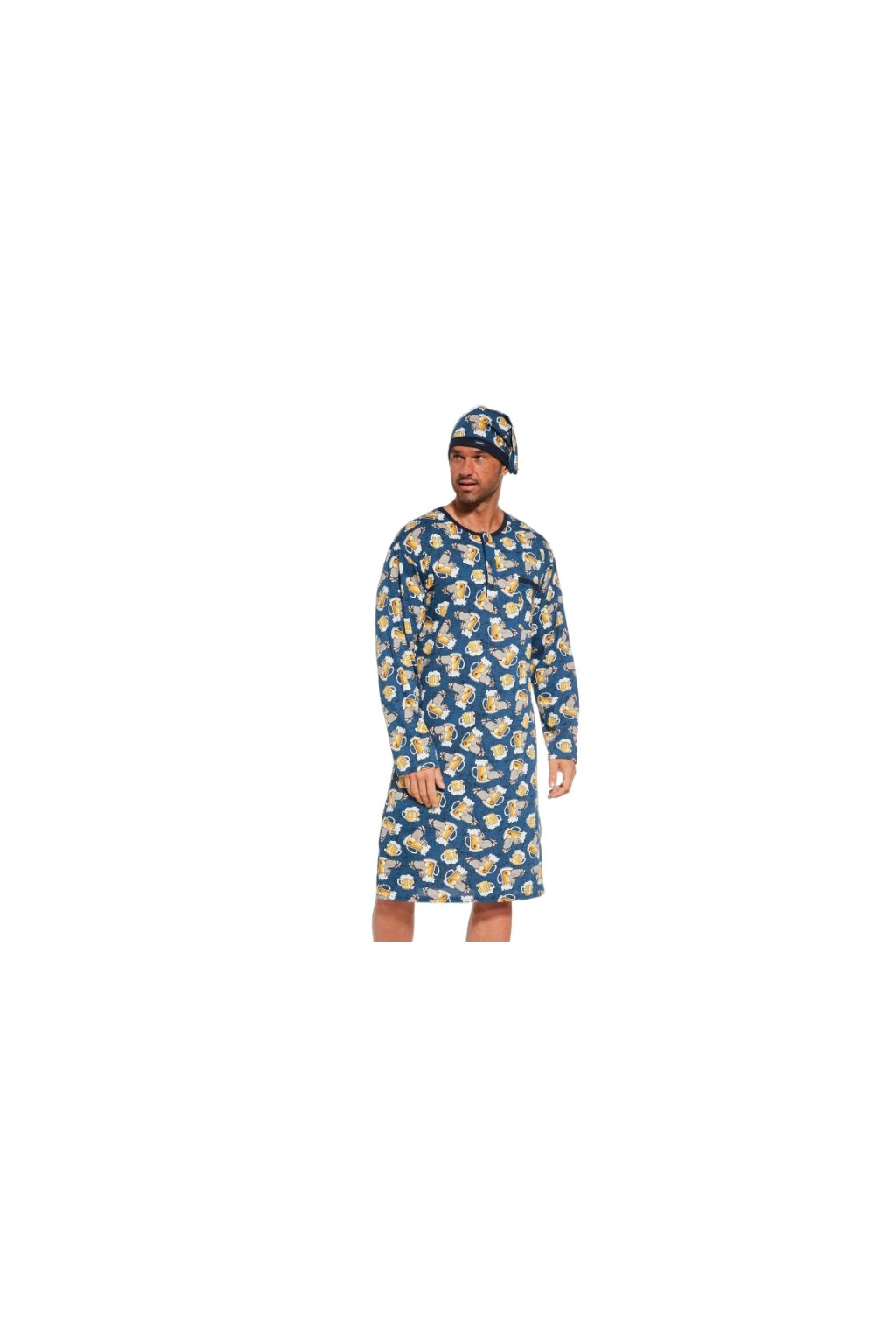 Pánská noční košile s dlouhým rukávem Cornette . Pánská noční košile s kulatým výstřihem má zapínání na tři knoflíčky, na hrudí má noční bavlněná košile našitou kapsičku, v kompletu je i čepice na spaní. Velmi kvalitní bavlna s jemným potiskem piv. Baleno v dárkové krabičce.