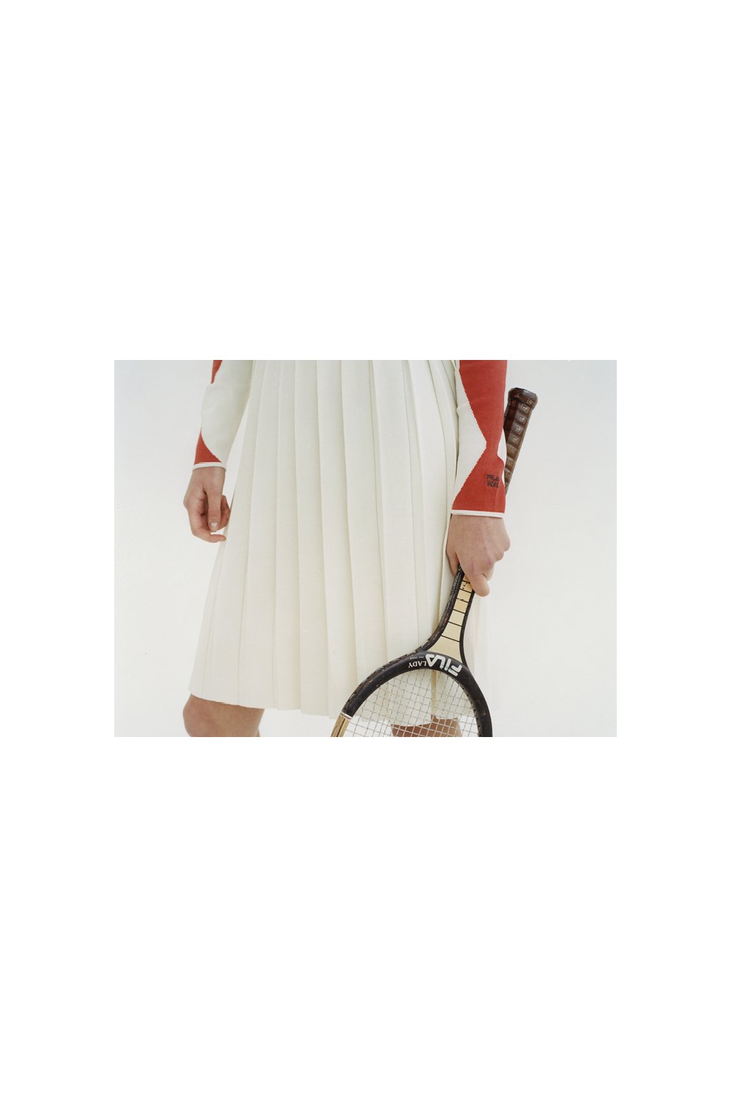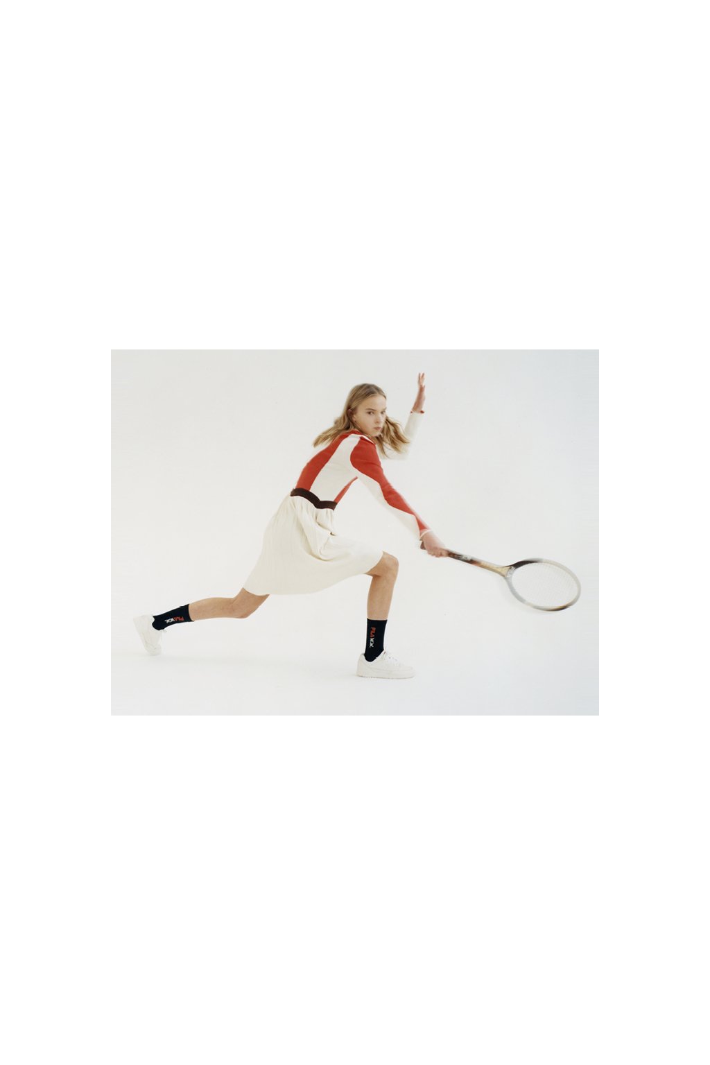 Šaty Serena Knitted Dress jsou tenisovým základem v ikonickém střihu. Jsou vyrobeny z pleteniny z interlock bavlny s panelovými detaily a plisovanou spodní částí. Košilový límeček s knoflíky v tónu látky dodává klasický vzhled, zatímco výšivka FILA by Wood Wood na rukávu přidává decentní značkový podpis.