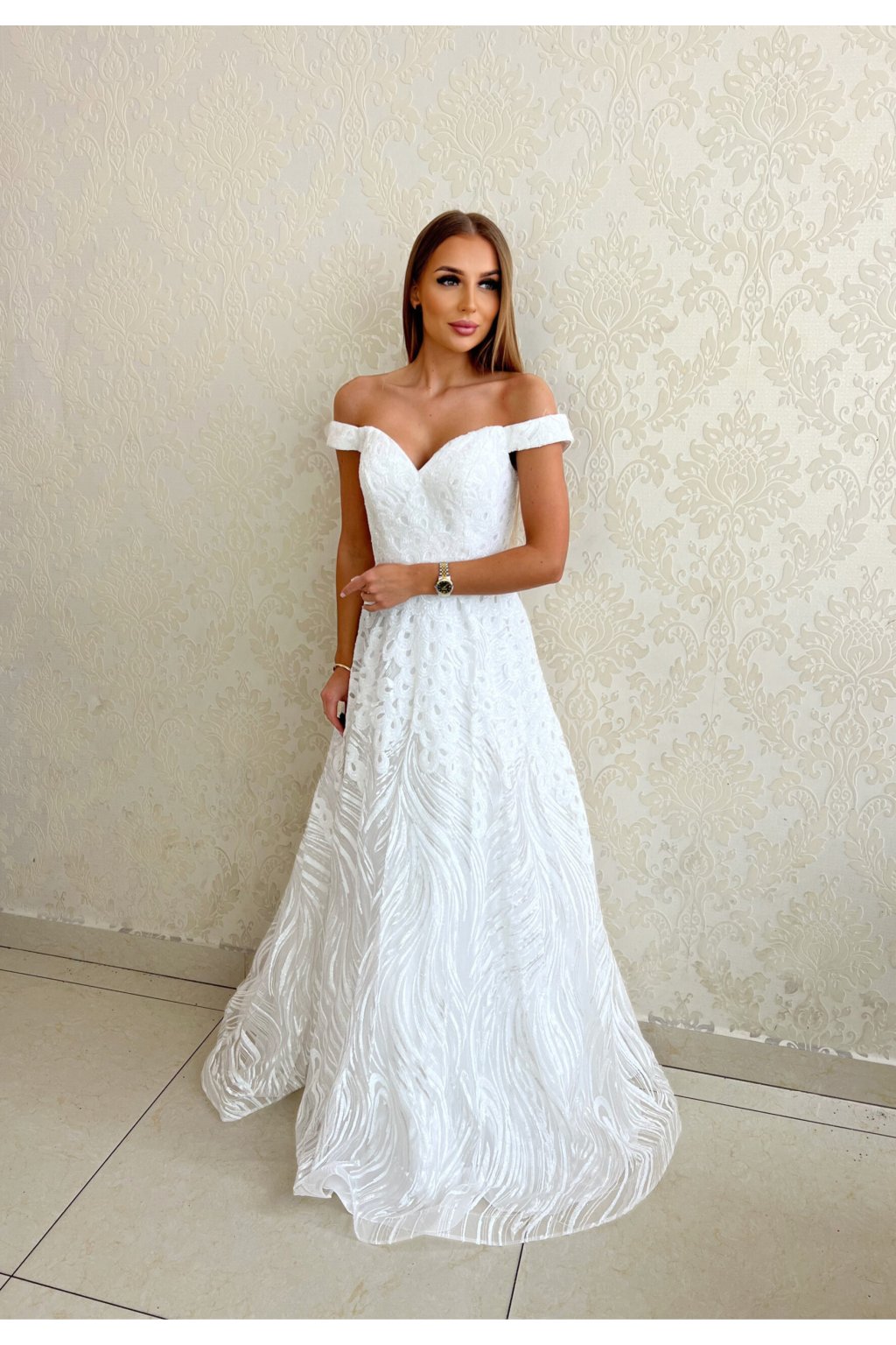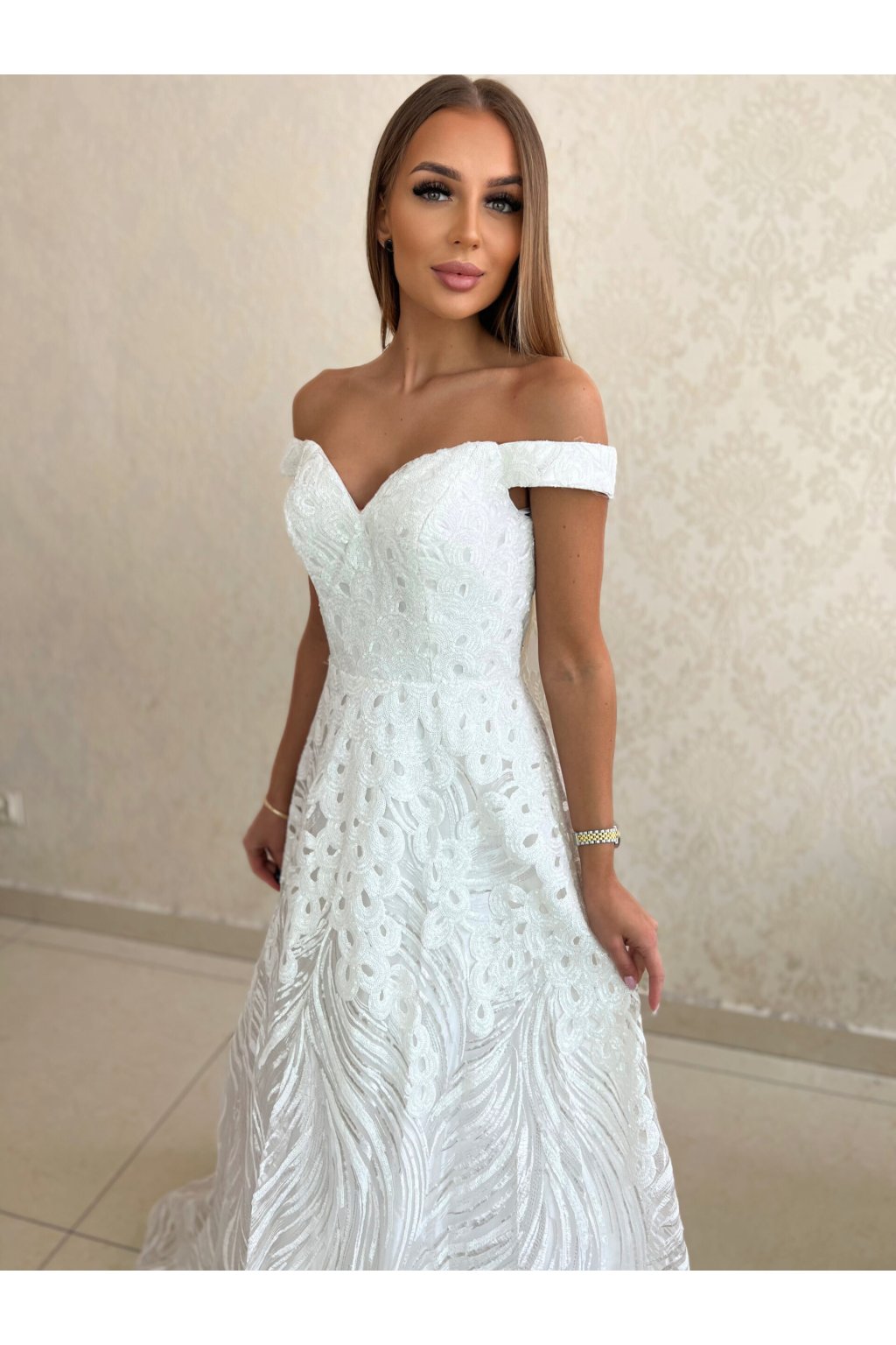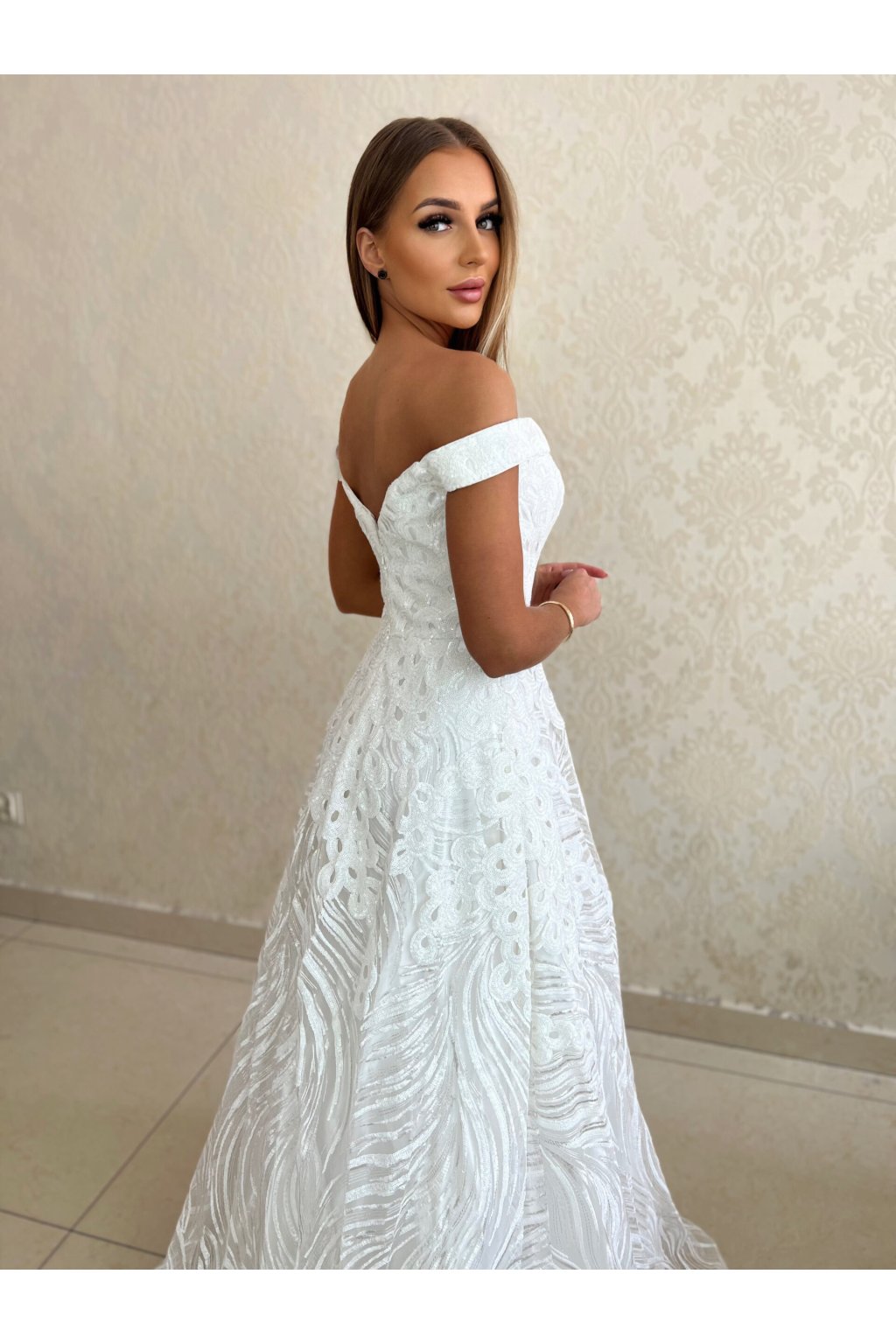Off-shoulder design: Šaty mají elegantní střih se spadlými ramínky, který jemně odhaluje ramena a dodává romantický nádech.