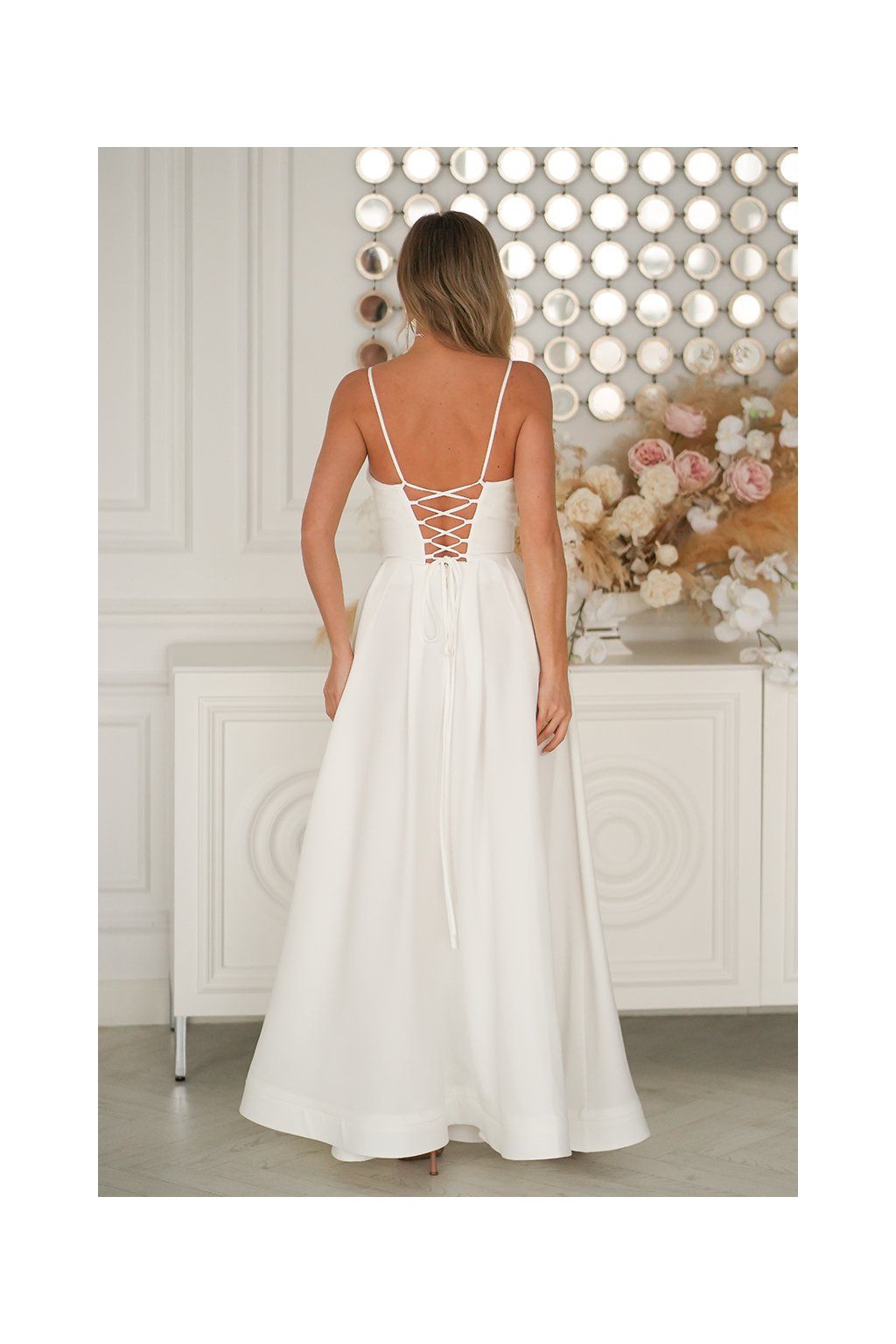 Stylový a moderní model vhodný na svatby, plesy i jiné slavnostní události. Přiléhavý živůtek s tenkými ramínky a jemně tvarovaným výstřihem zvýrazní dekolt, zatímco volné široké nohavice působí elegantně a prodlužují siluetu. Praktické kapsy dodávají modelu pohodlí i nenucený šmrnc.