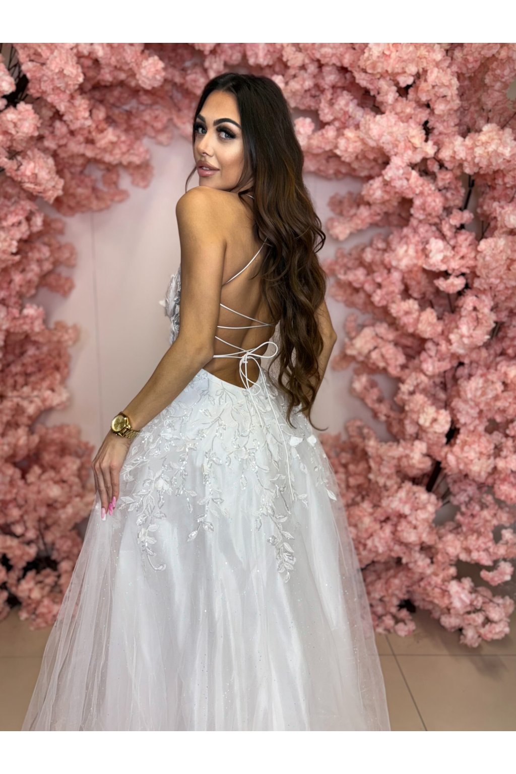 - Zapínání: Šaty mají otevřená záda se šněrováním, které umožňuje dokonalé přizpůsobení postavě.