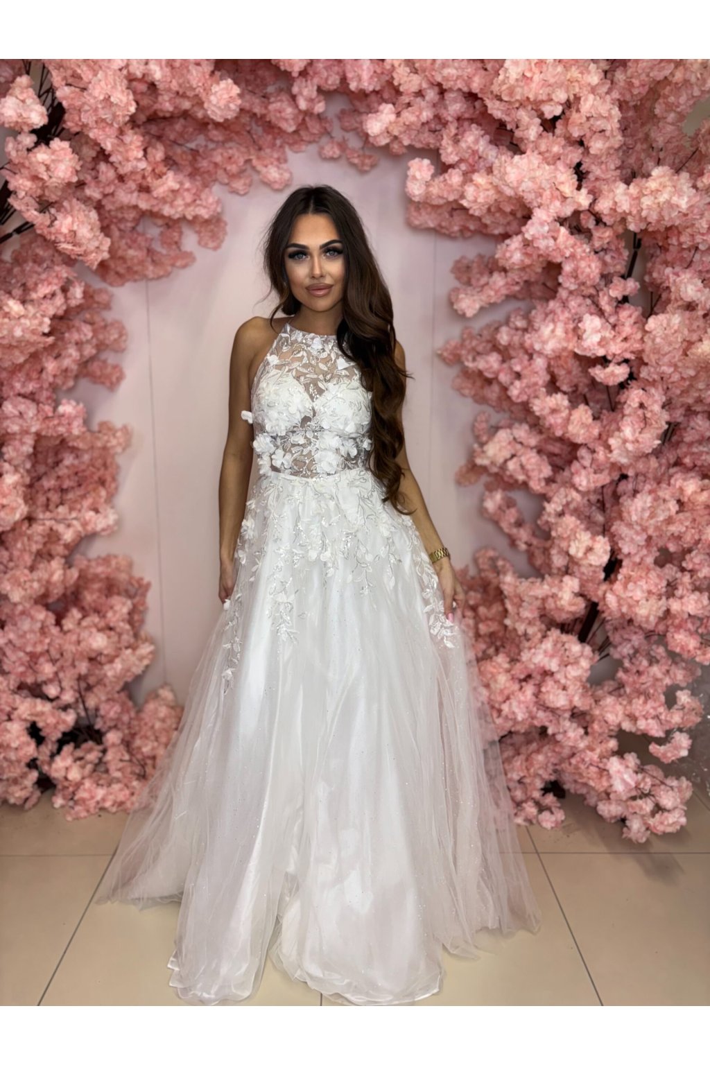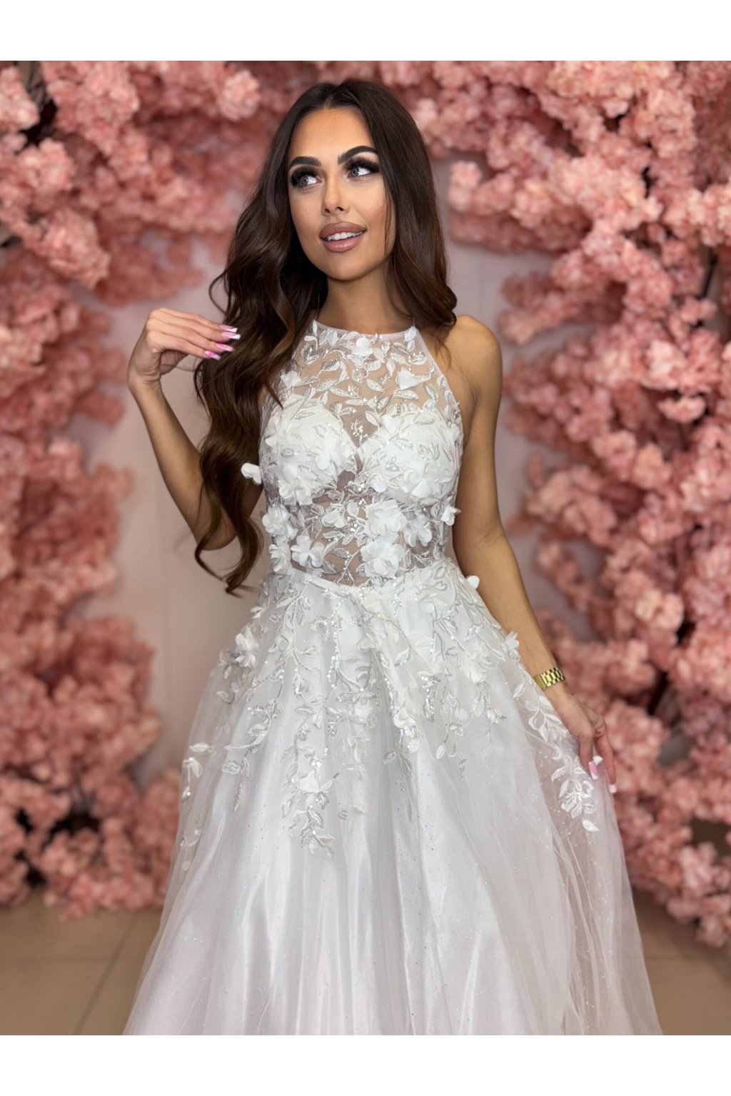 - Detaily: Průhledný krajkový živůtek s květinovými aplikacemi dodává šatům romantický a sofistikovaný vzhled.
