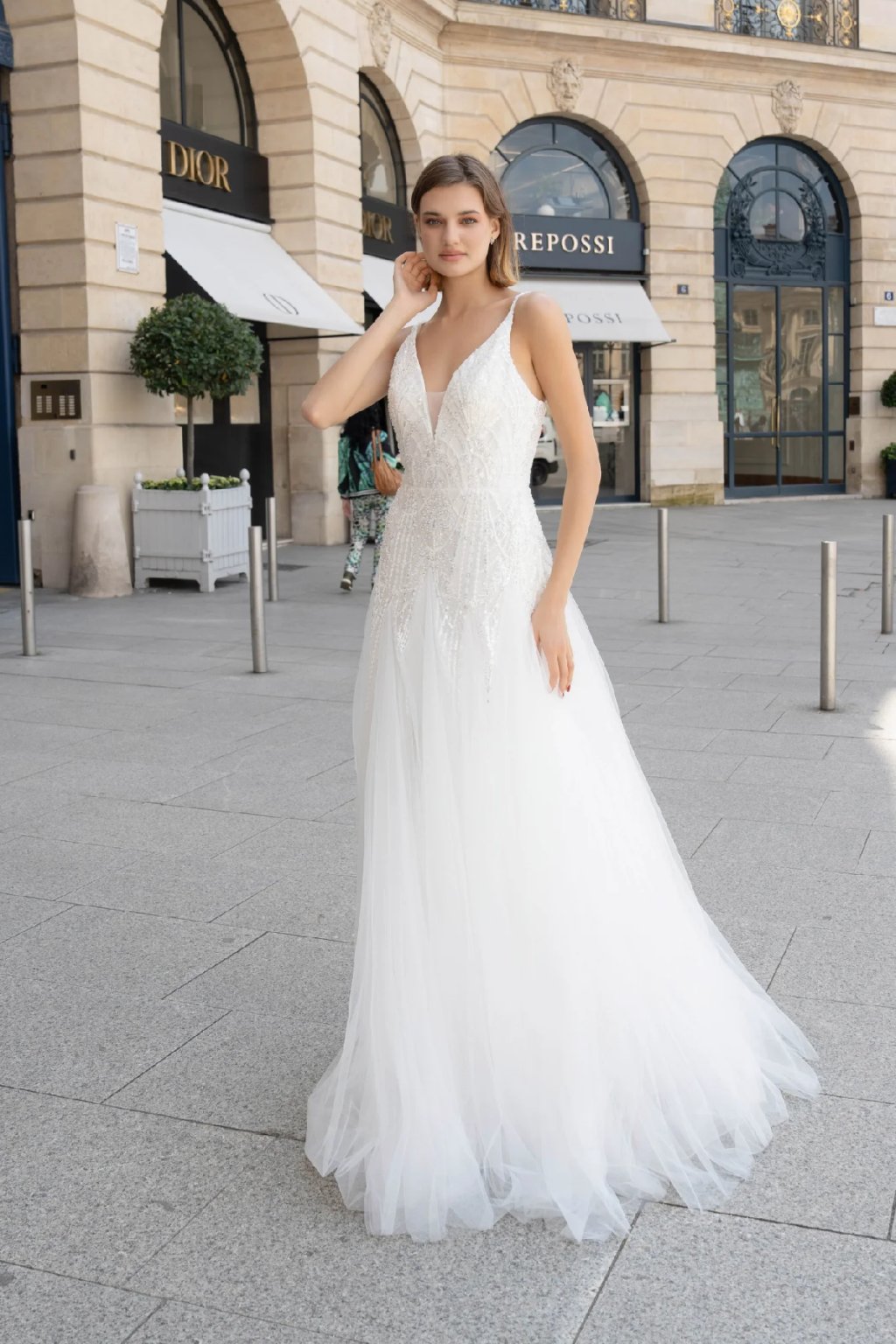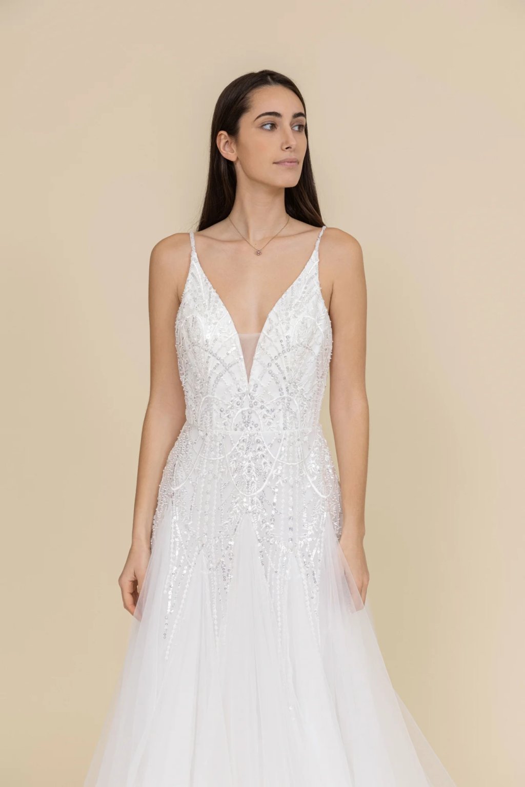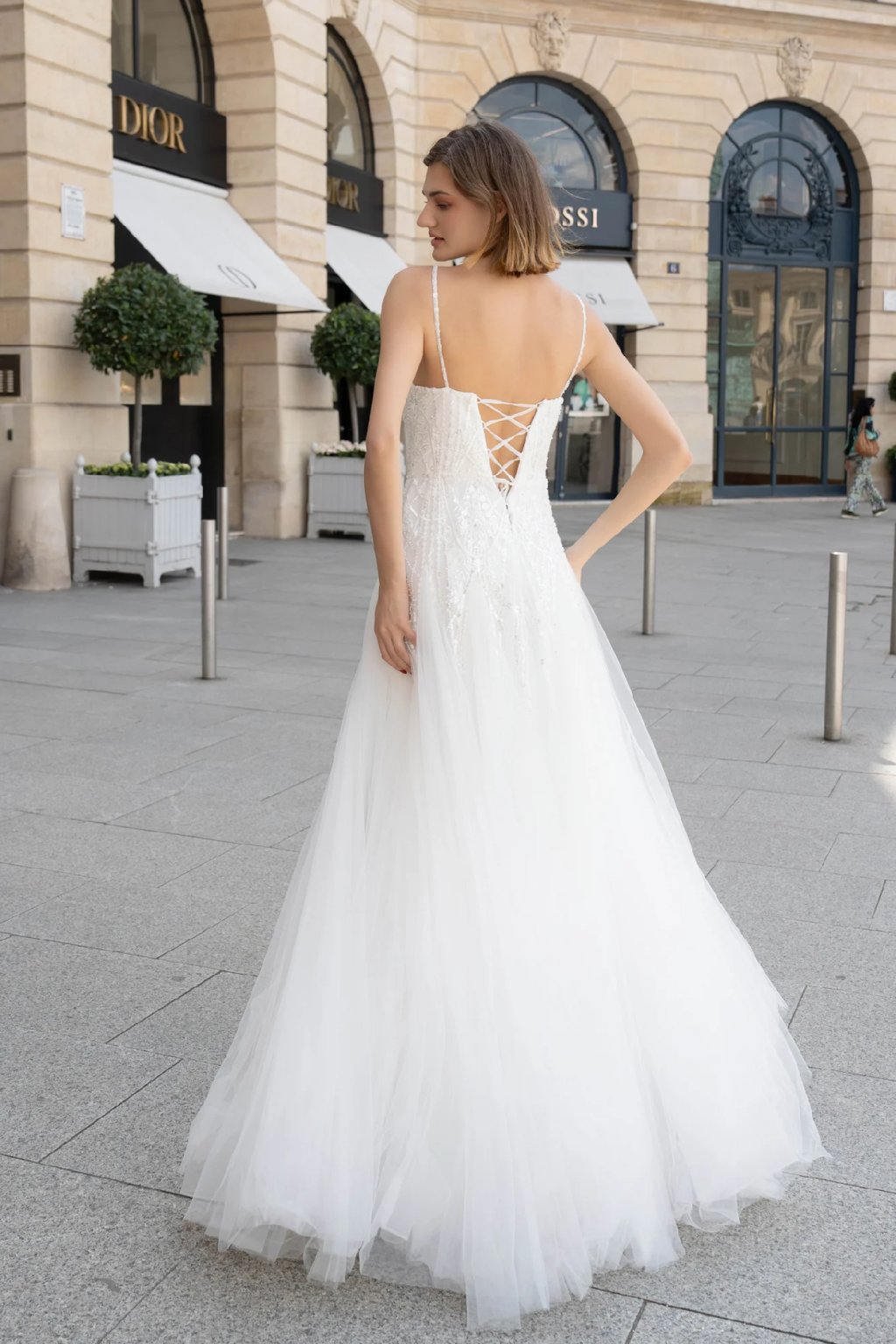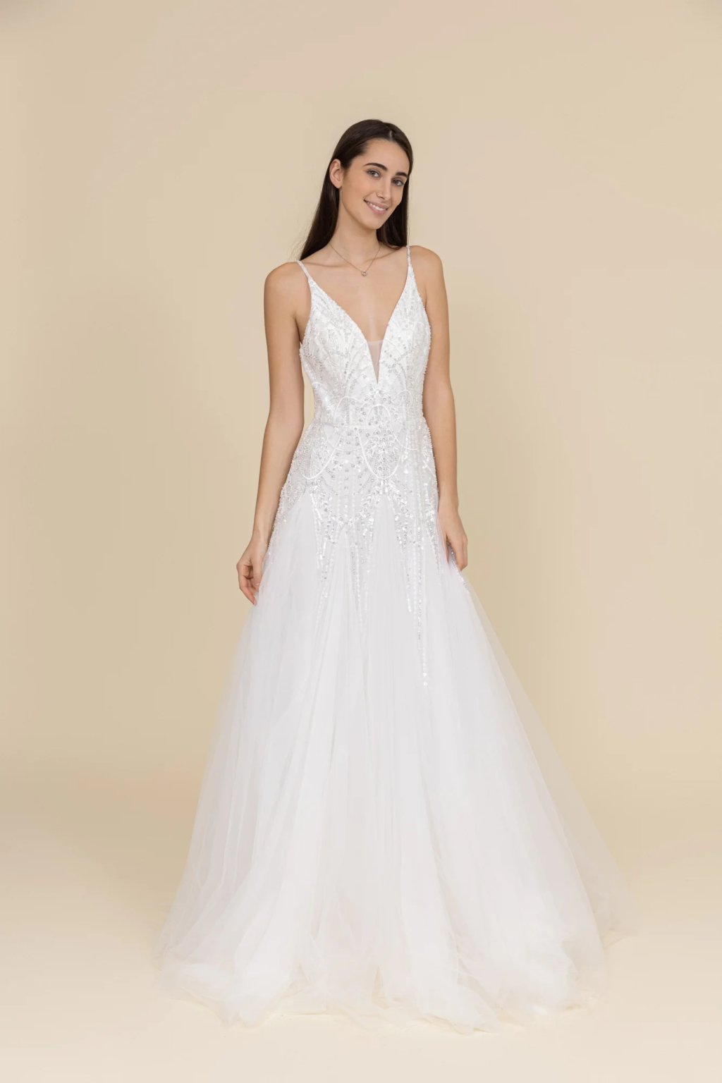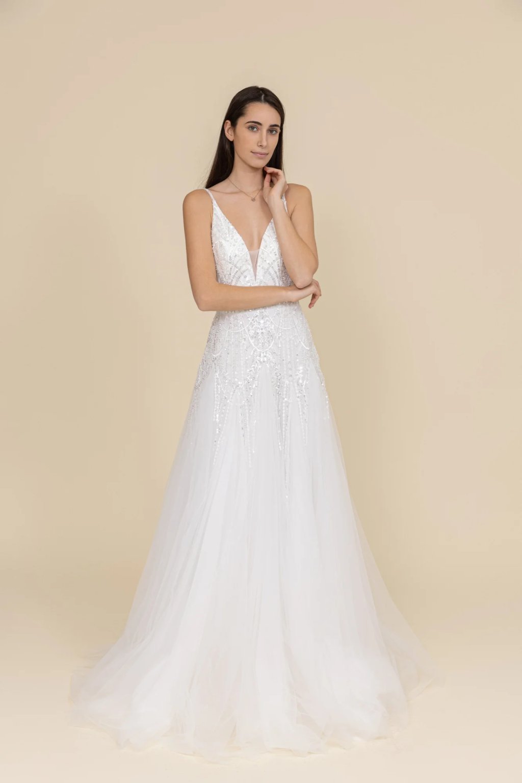 Romantické svatební šaty značky Pink Boom okouzlí svou jemností a nadčasovou elegancí. Hluboký výstřih ve tvaru V v kombinaci s korzetovým živůtkem zdobeným jemným flitry podtrhne ženskou siluetu. Lehká tylová sukně působí vzdušně a étericky, ideální pro princeznovskou svatbu.