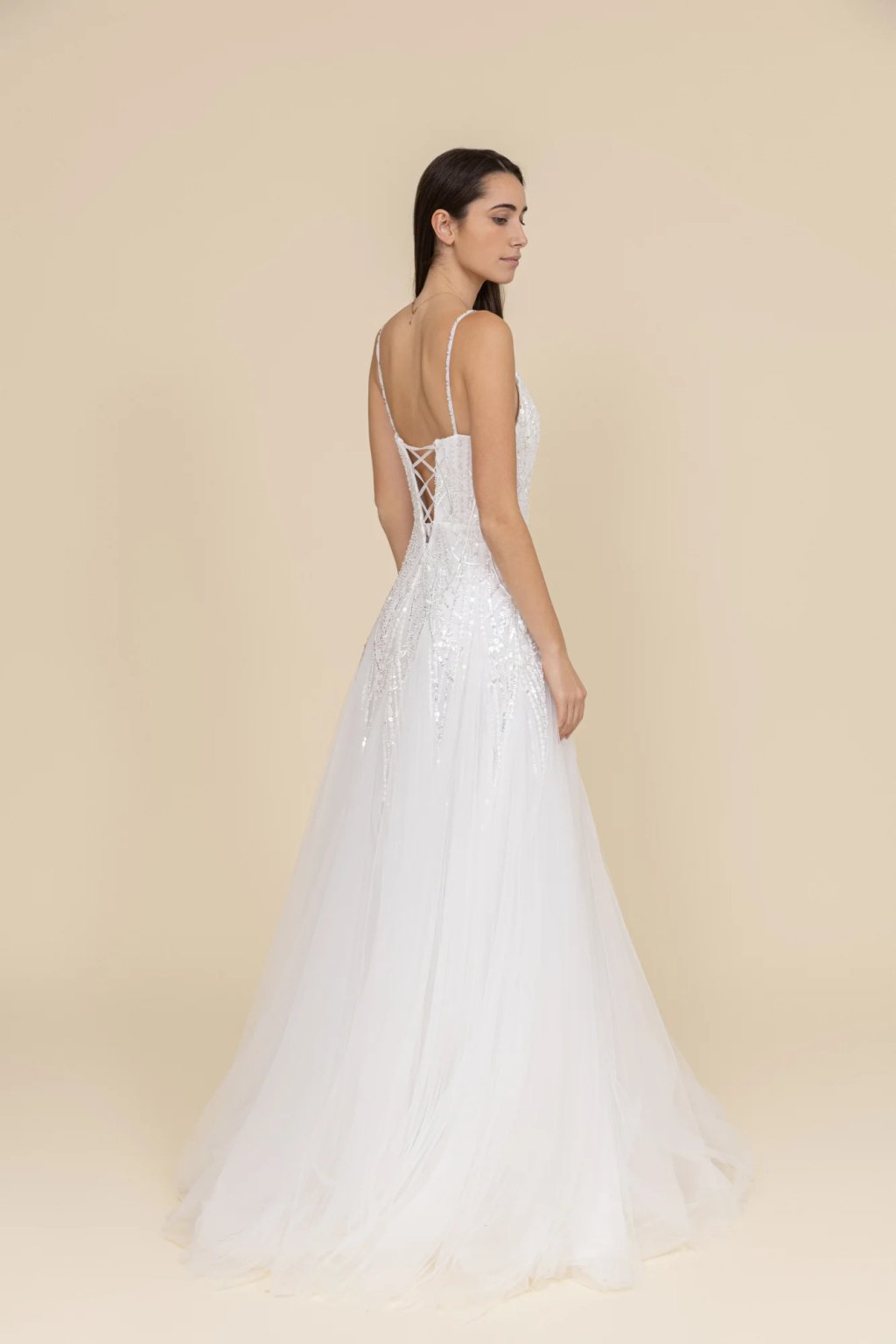 Zadní část zdobí šněrování, které nejen krásně vypadá, ale umožňuje i přizpůsobení šatů postavě.