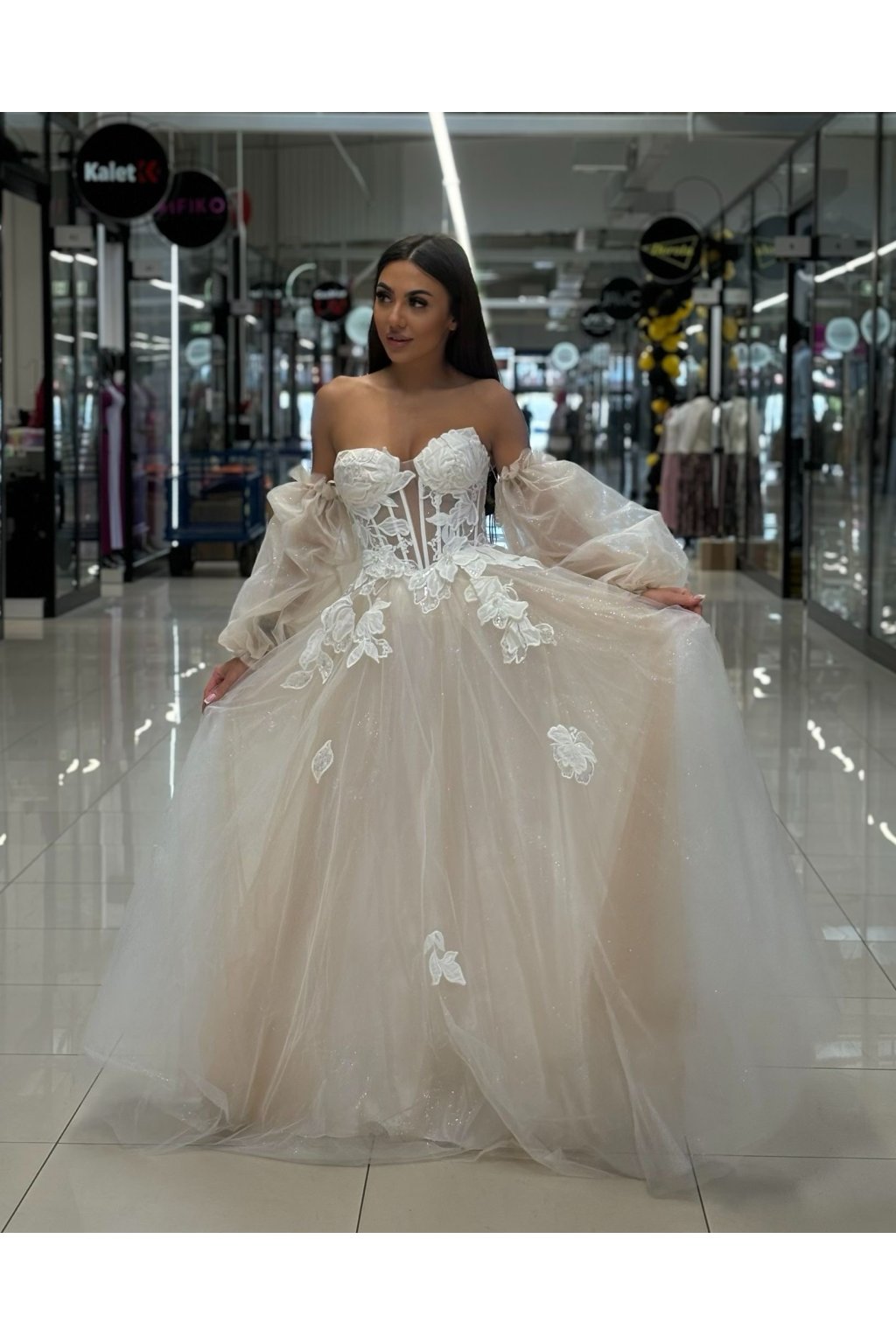 - Bohaté zdobení: Šaty jsou zdobeny jemnými krajkami a třpytivými detaily, které dodávají celkovému vzhledu luxusní a elegantní ráz.