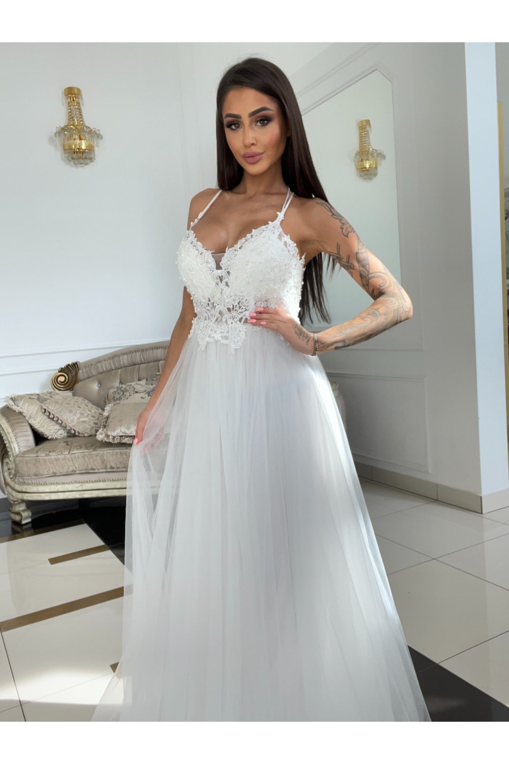 Tyto něžné bílé šaty zaujmou svou jemností a nadčasovou elegancí. Vrchní část tvoří detailně propracovaný krajkový živůtek s tenkými ramínky, které jsou na závitku zdobené drobnými perličkami. Tento romantický prvek dodává šatům exkluzivní vzhled.