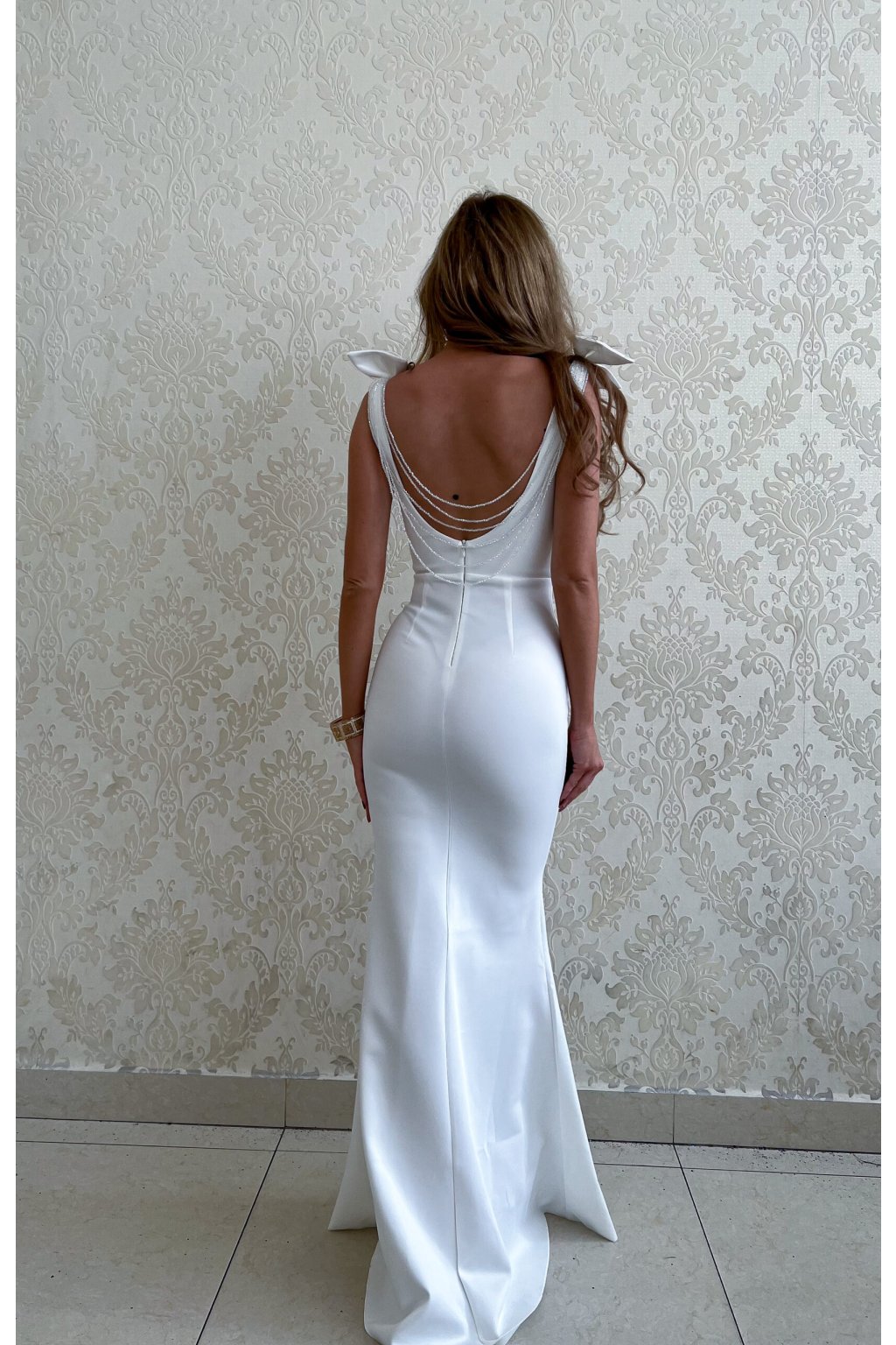 Lesknoucí korálkové zdobení na zádech, které dodává šatům luxusní, slavnostní nádech .