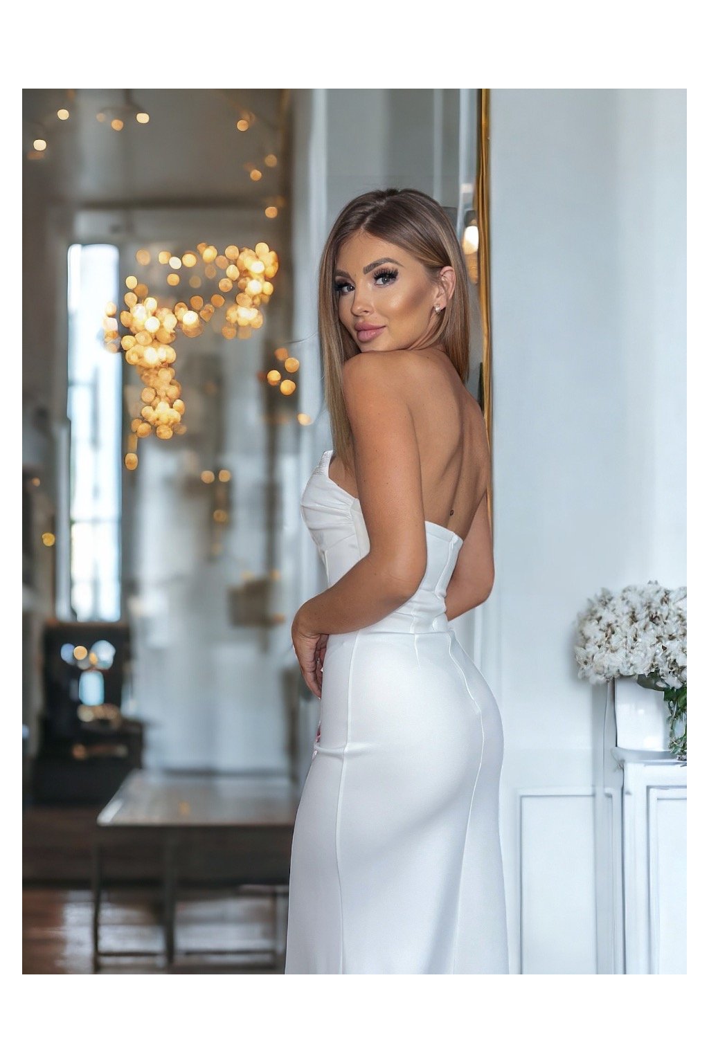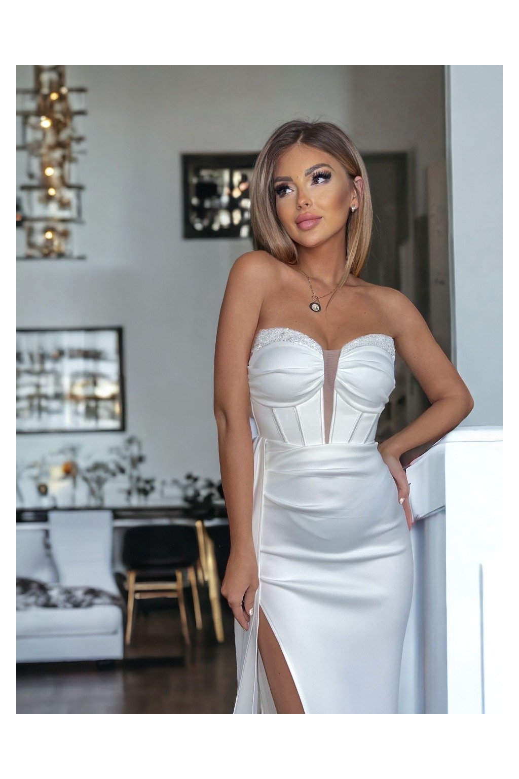 Zaujměte na první pohled v těchto luxusních bílých šatech, které v sobě spojují eleganci, ženskost a moderní střih. Hladký saténový materiál krásně odráží světlo, což dodává šatům slavnostní nádech.